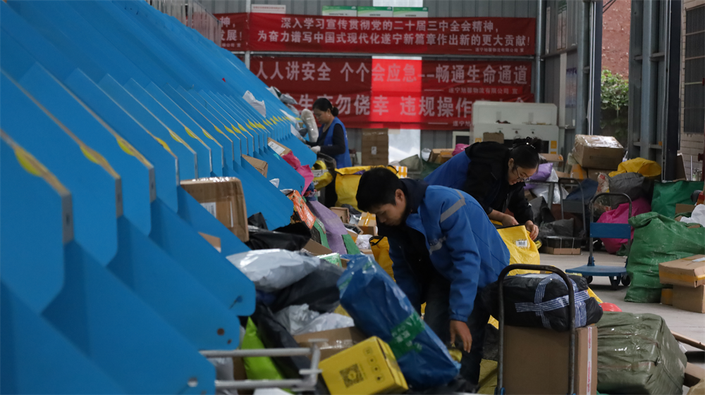 得益于安居邮政与区内6家民营快递、2家直营快递企业签订邮快合作协议,实现了区域邮快合作全覆盖,每个乡镇都有快递点。快递到达乡镇的统一分拣站后,由邮政的工作人员进行再次分拣,按街道和村社进行细分,最后运输至整个快递物流链条的最小“点位”——金通·邮快驿站。