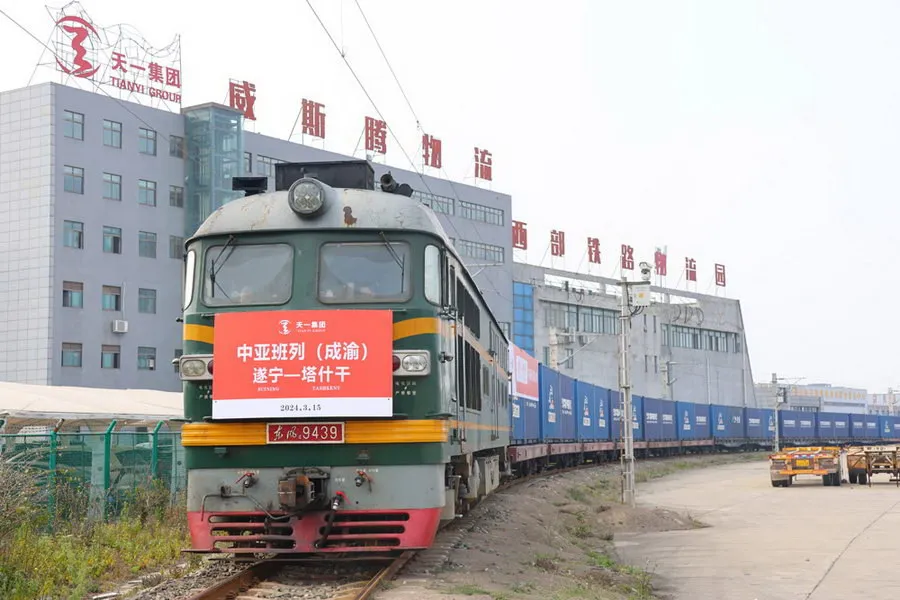 3月15日,满载110个集装箱聚酯切片货品的快线班列从四川威斯腾物流有限公司铁路专用线启程,途径霍尔果斯口岸,发往乌兹别克斯坦塔什干,这是一趟“一单制”“门到门”的“公转铁”快线班列。该班列由遂宁天一投资集团有限公司运营,作为遂宁陆港型国家物流枢纽城市的建设主体、运营主体,该公司对接物流园区、枢纽节点城市,开展公铁联运;与沿江、沿海港口合作,开展公铁水联运。