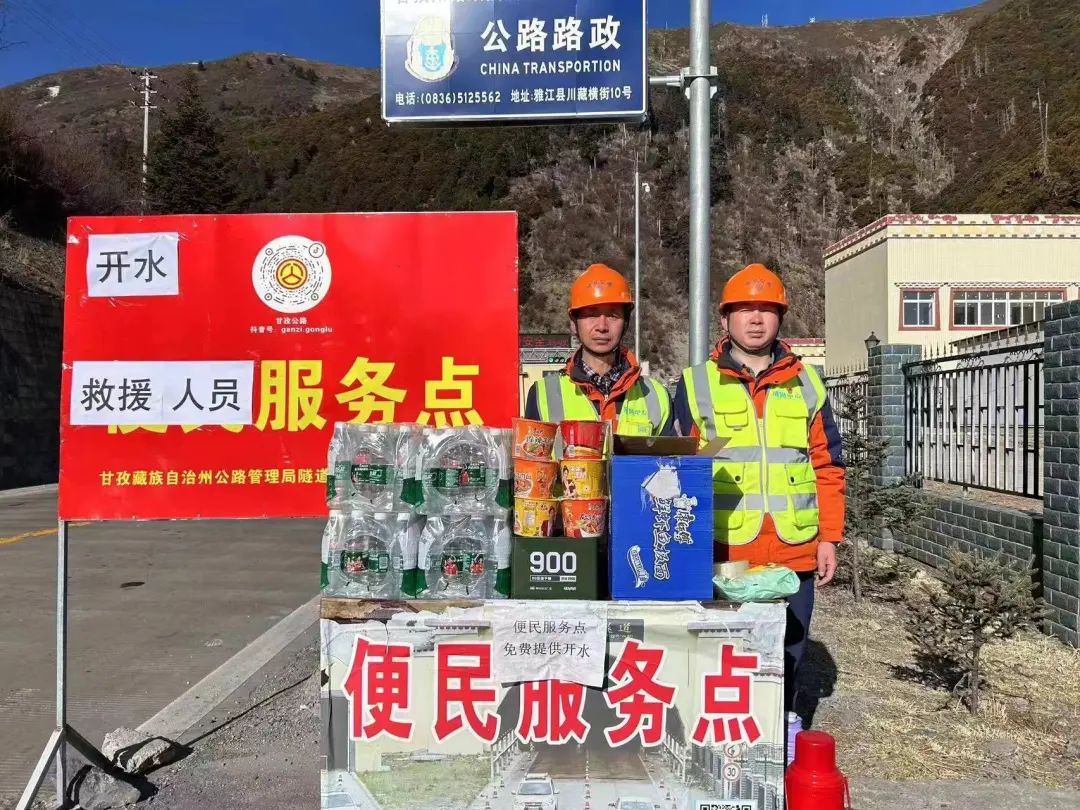 甘孜州公路建设服务中心在国道318线沿线设置救援人员、物资运送人员服务点,提供矿泉水、方便面、压缩饼干、开水等,全力做好抢险人员服务保障工作。