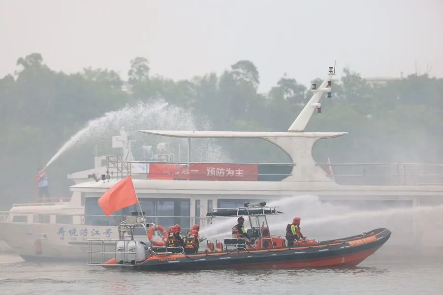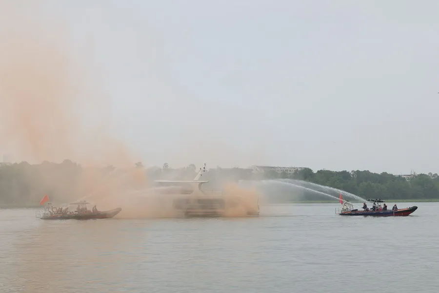 演练以汛期暴雨突袭遂宁,涪江水位上涨、涪江流域水流加速为主背景,模拟观音湖一艘环岛游轮在运行过程中突然失控失去动力,撞向旁边另一艘在航渡船,其间,一名乘客突发疾病晕倒,一艘船舶失火、燃油泄漏。险情发生后,船山区人民政府立即成立现场应急指挥部,组织交通、应急、海事、民兵等力量开展救援,排除现场船舶险情、转移患病乘客、控制扑灭船舶的火势、完成水域污染控制与清除等工作。