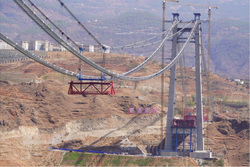 历经约4小时精密作业,蜀道集团投建的沿江高速川滇金沙江特大桥跨中首段吊装成功,标志着大桥施工正式进入钢桁梁吊装阶段。该桥地处高地震烈度区(Ⅷ度0.3g),为我国千米级悬索桥地震烈度最高者,主桥为1060米单跨双塔钢桁梁悬索桥。