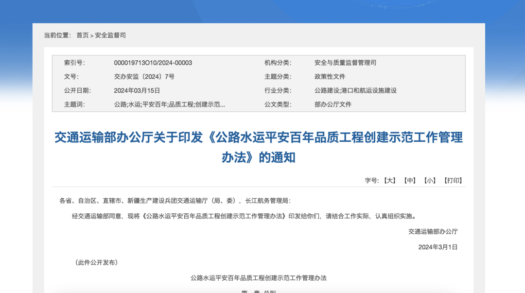 近日,交通运输部网站发布了《公路水运平安百年品质工程创建示范工作管理办法》(以下简称《管理办法》)。