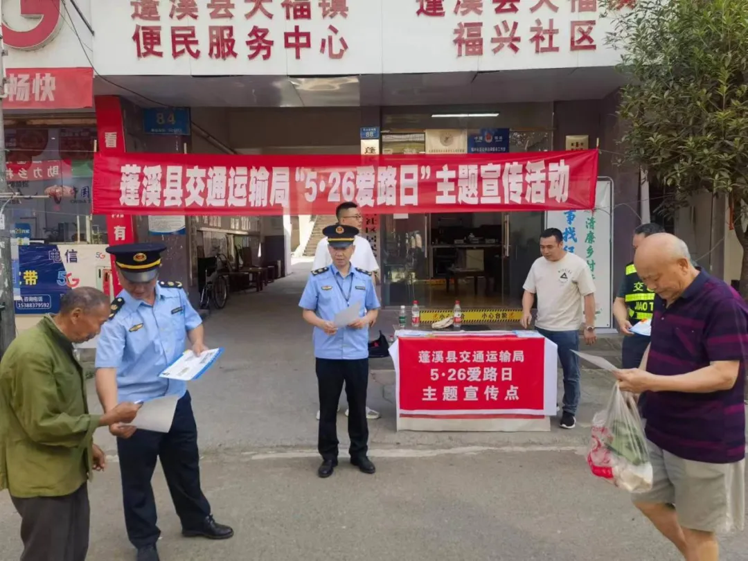 5月26日,蓬溪县交通运输局组织局机关相关股室、局属各单位及运输企业在全县开展“5.26”爱路日宣传活动,进一步提高广大市民爱路护路意识,共同营造“人民公路人民爱,人民公路人民护”的良好氛围,确保道路运输安全。