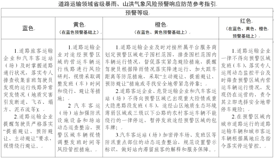 黄色预警,在蓝色预警响应措施基础上,督促运输企业开展对途经预警区域的营运车辆运行线路风险研判,视情采取调整发班时间和绕行、避让等措施。客运班车临时改道时间在7日以内的,由客运企业自行调整,并在3个工作日内报交通运输部门备案。