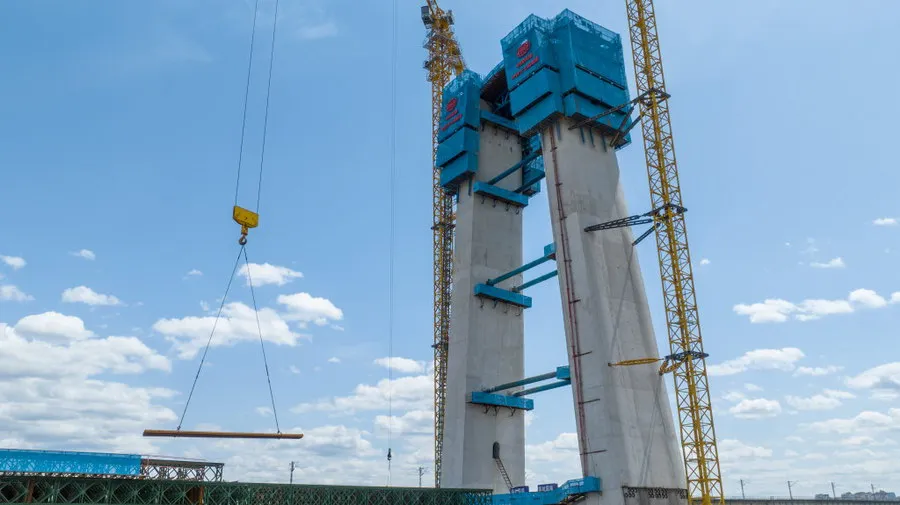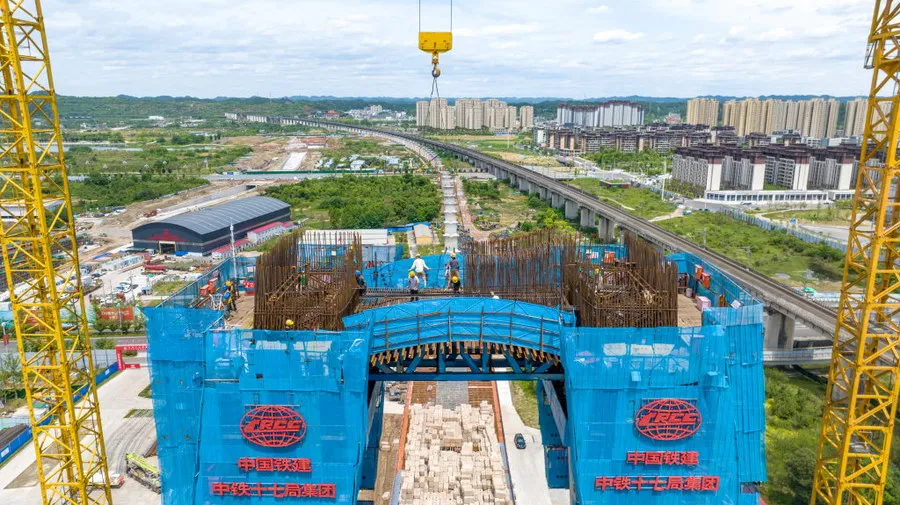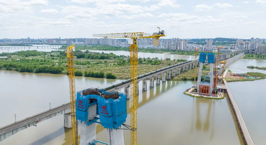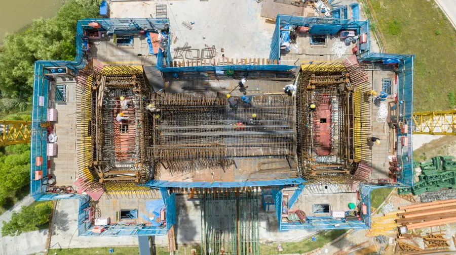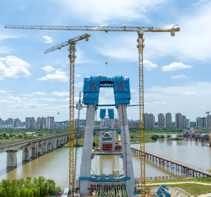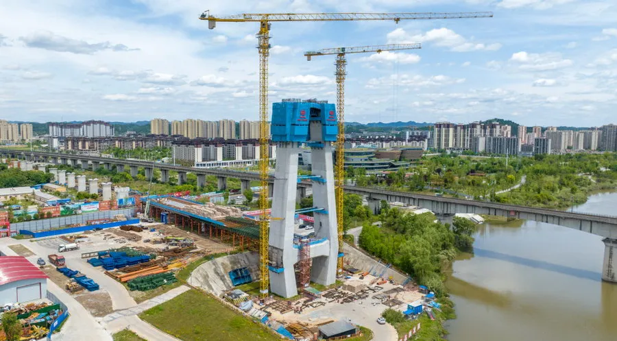 4月30日,在成达万高铁遂宁涪江特大桥项目施工现场,工人们正加紧主桥施工。“五一”期间,近500名建设者将坚守岗位,抓工期、抢进度,奋力冲刺施工目标,确保按照时间节点完成主塔封顶。 据介绍,作为西南地区同类型桥梁中跨度最大的双塔斜拉桥,该桥主跨全长305米,目前90号主塔已施工至70米,正在进行上横梁钢筋安装;91号主塔已完成68米,正在进行钢筋绑扎;主桥整体施工进度已达50%。