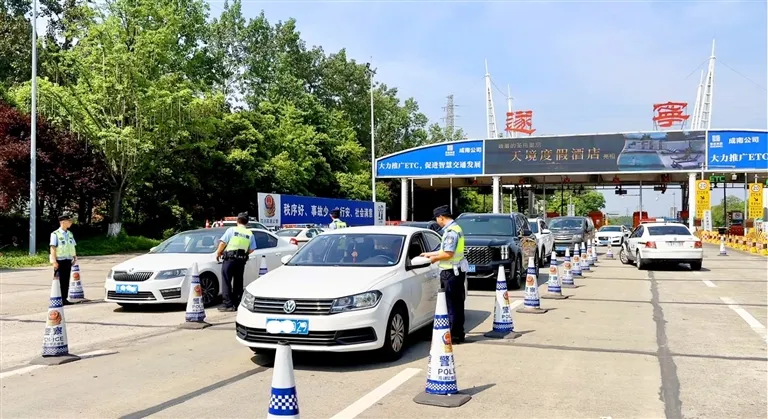 随着“五一”小长假进入尾声,我市各高速站口迎来返程车流高峰,记者在遂宁收费站看到,出入高速公路的车辆有序通行,四川高速公安民警五分局三大队民警进入忙碌状态,在收费站出口设置了两排通道,两人一组检查出入车辆。