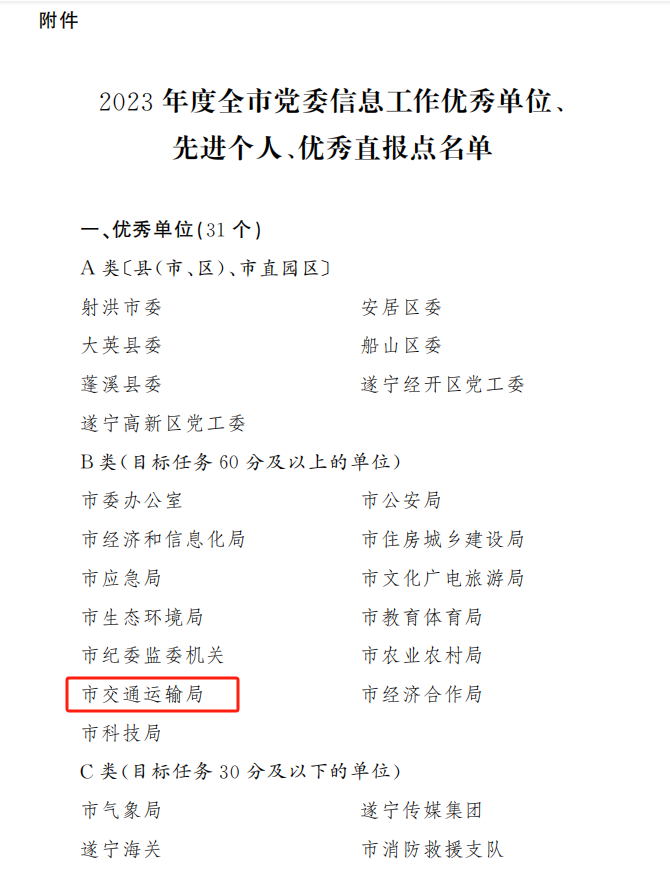喜报 | 遂宁市交通运输局获2023年度全市党委信息工作优秀单位