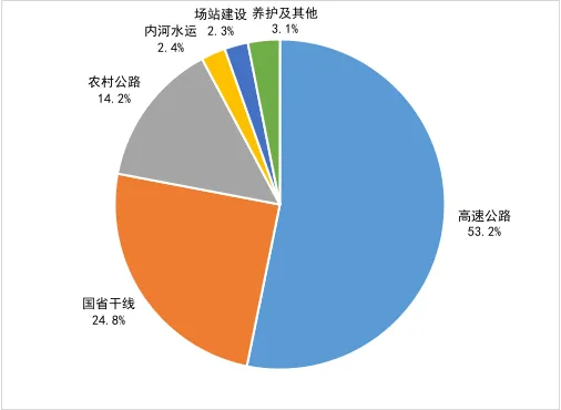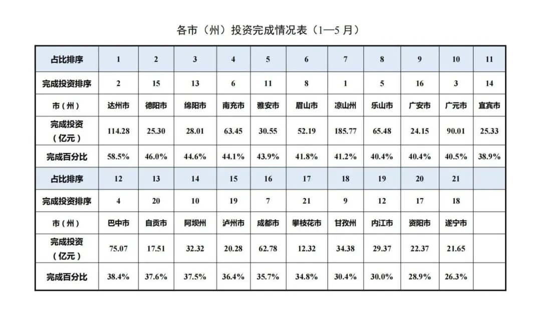 总体投资完成情况 1—5月全省公路水路交通建设完成投资1032.81亿元,占年度目标2600亿元的39.7%。 专项投资完成情况 (一)公路建设 1—5月完成投资976.02亿元。 高速公路 完成投资549.54亿元,占全省公路水路交通建设完成投资1032.81亿元的(以下简称占比)53.2%,占年度目标的36.6%。 国省干线 完成投资255.99亿元,占比24.8%,占年度目标的41.3%。 农村公路 完成投资146.67亿元,占比14.2%,占年度目标的52.4%。 场站建设 完成投资23.82亿元,占比2.3%,占年度目标的52.9%。 (二)内河水运 1—5月完成投资24.68亿元,占比2.4%,占年度目标的41.1%。 (三)养护及其他专项 1—5月完成投资32.12亿元,占比3.1%,占年度目标的33.8%。 ▲2024年1—5月全省公路水路完成投资总量构成图 市(州)投资完成情况 全省21个市(州)中6个市州完成计划目标41.5%以上。其中,达州市、德阳市、绵阳市完成情况较好,分别为58.5%、46.0%、44.6%;凉山州、达州市、广元市3个市(州)完成投资额较高,分别完成185.77亿元、114.28亿元、90.01亿元。