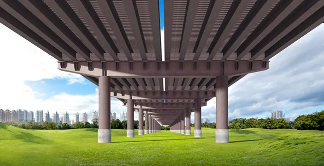 公司自研型钢-混凝土组合桥梁技术采用钢管、钢箱、H型钢梁、波折钢板等型钢与自密实混凝土共同组成新型桥梁结构,极大简化了钢结构加工技术,实现了工厂标准化制造,大幅度降低施工难度,减少施工环境污染。该技术可使全寿命期碳排放量减少≥50%,全面实现了低碳化、智能化、装配化目标。