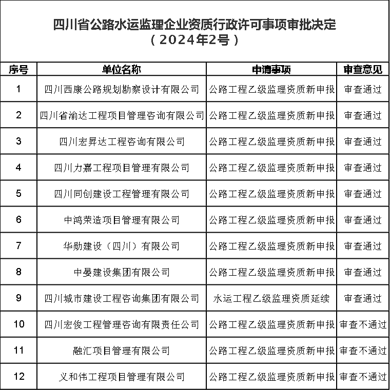 《中华人民共和国行政许可法》《公路水运工程监理企业资质管理规定》(交通运输部令2022年第12号)等文件规定,我厅对四川西康公路规划勘察设计有限公司等12家企业递交的监理资质申报材料进行了审查,并将审查意见进行了社会公示,现将审批决定予以通告。