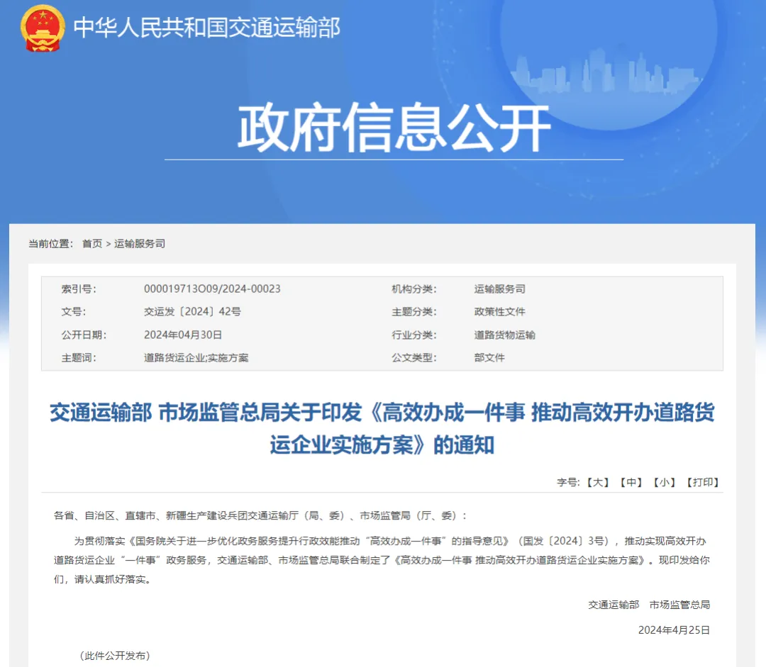 日前,交通运输部、市场监管总局联合印发《高效办成一件事 推动高效开办道路货运企业实施方案》(简称《实施方案》),优化开办道路货运企业涉及的政务服务流程,强化业务协同和数据共享,线上开通业务受理模块,实现“全程网办、一网通办”,线下设立工作专窗,实现“一窗受理、限时办结”,最大限度利企便民,全面提升人民群众的获得感、满意度。