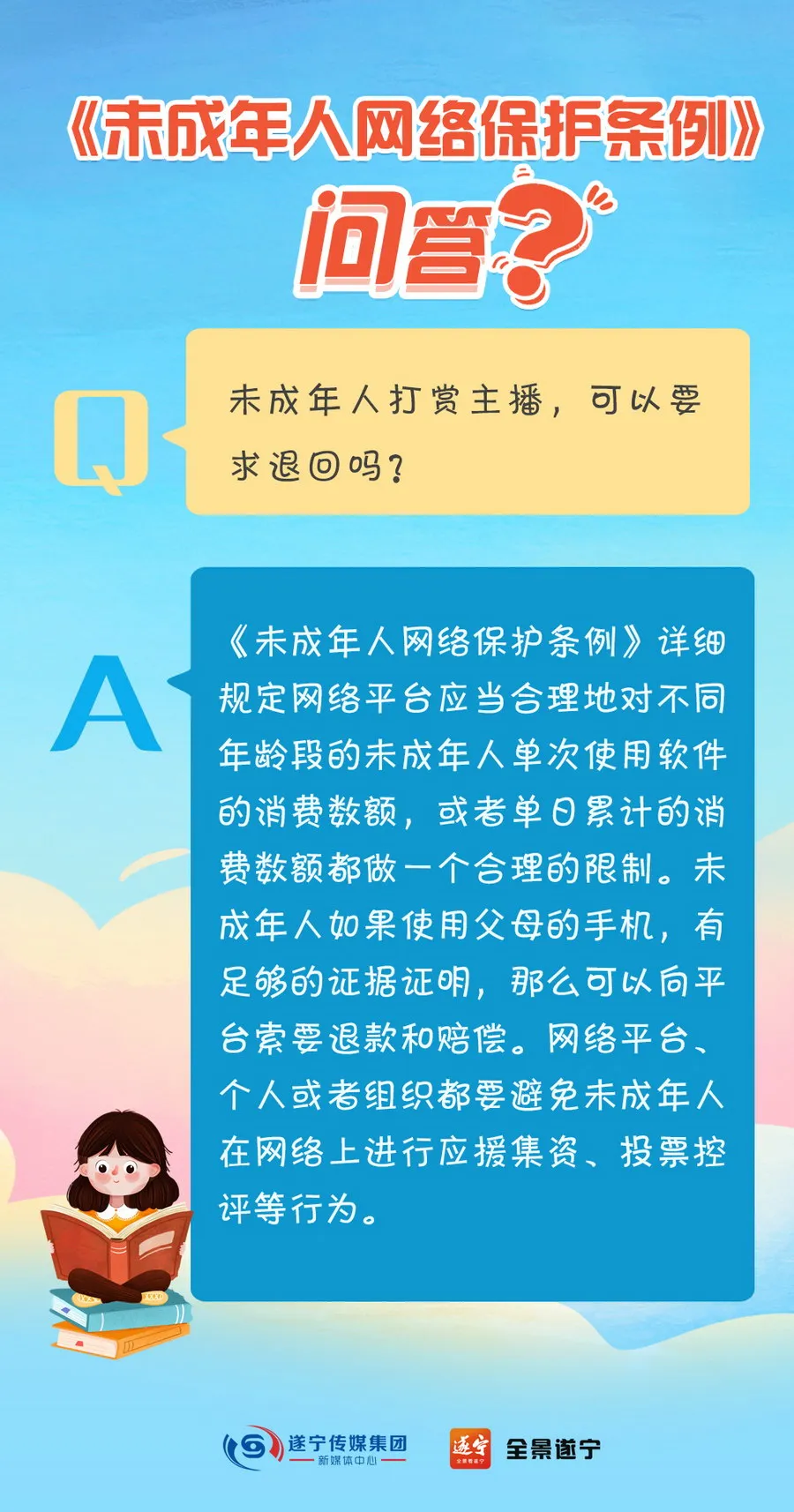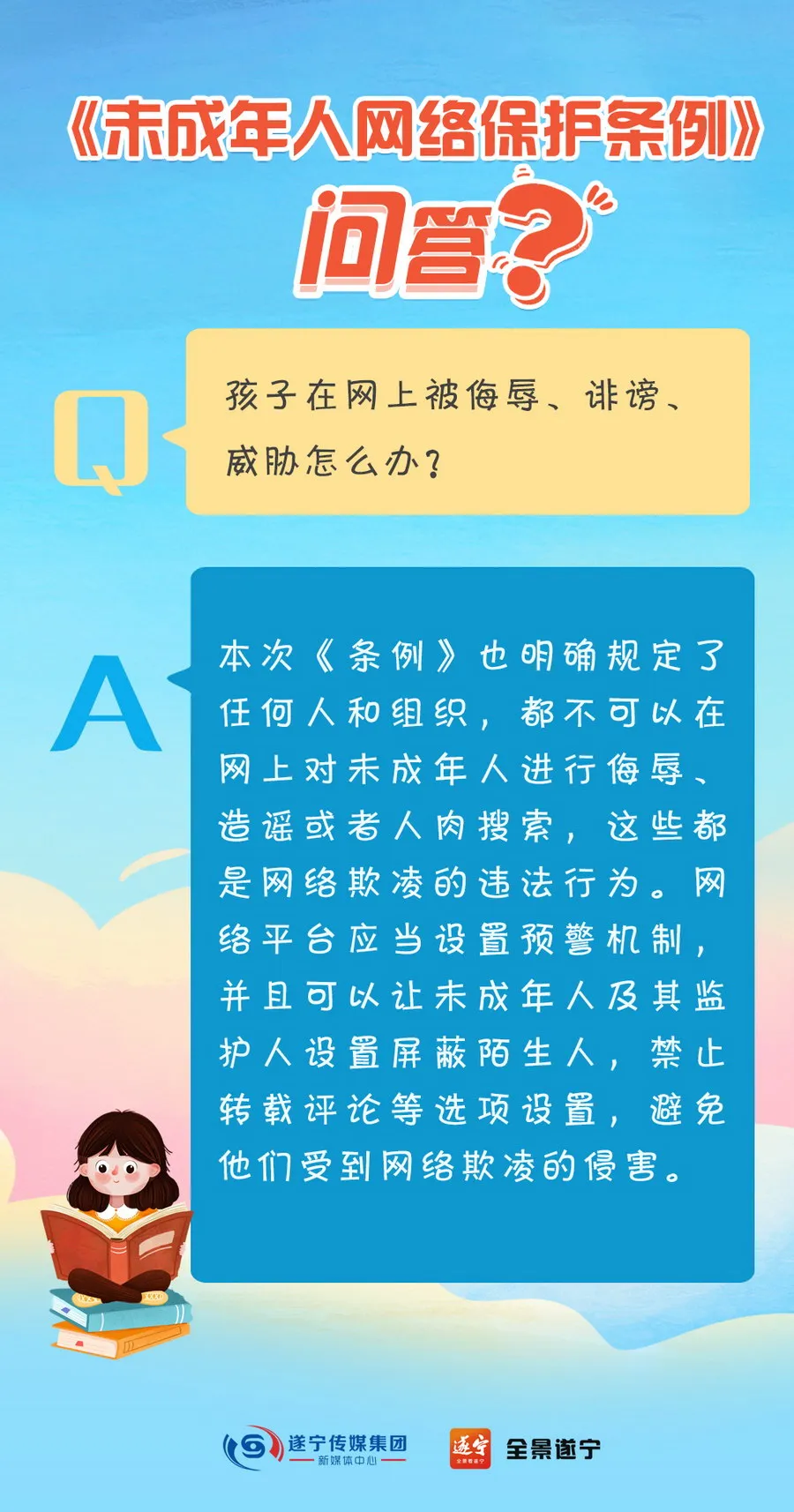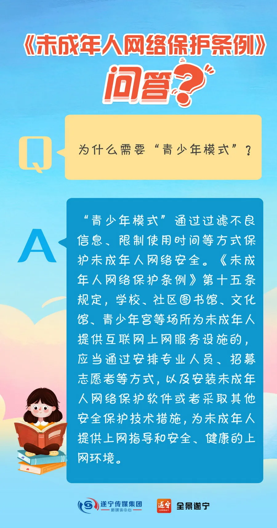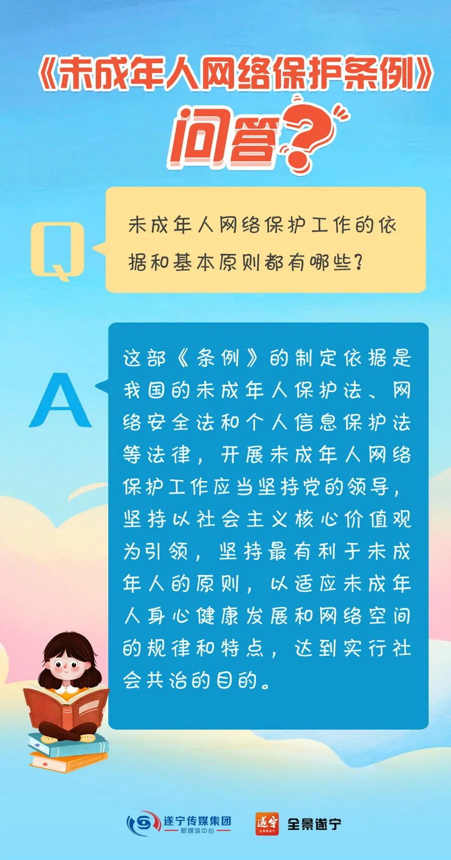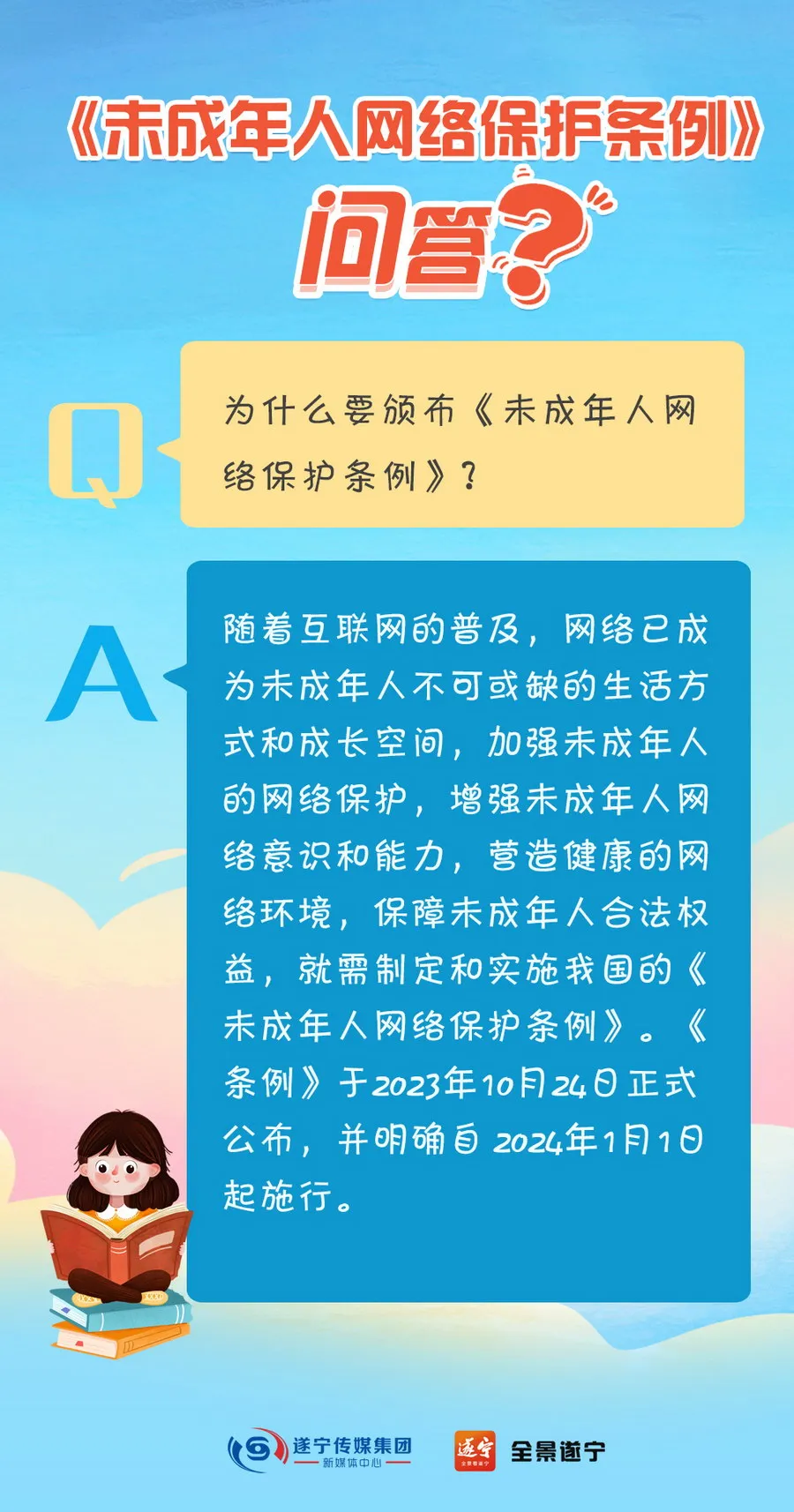 2024年1月1日起《未成年人网络保护条例》(以下简称《条例》)正式施行《条例》共7章60条重点对促进网络素养、规范网络信息内容、保护个人信息、防治网络沉迷等方面作出规定一组问答海报带你学习《条例》重点↓↓来源:全景遂宁