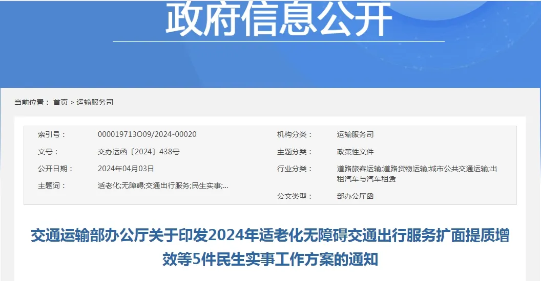 近日,交通运输部公布2024年适老化无障碍交通出行服务扩面提质增效等5件民生实事工作方案。