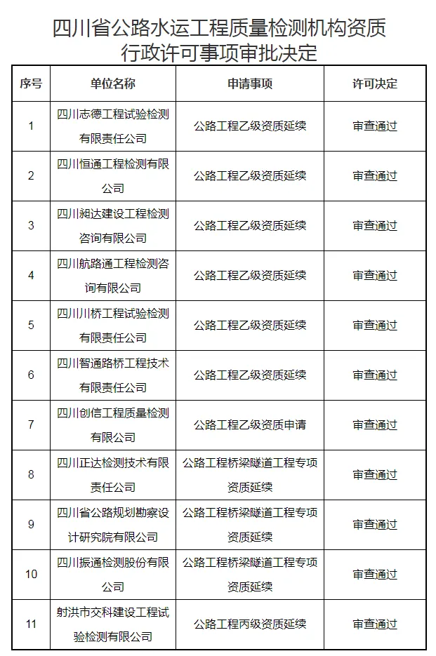 根据交通运输部《公路水运工程质量检测管理办法》(交通运输部令2023年第9号)、交通运输部《关于公布〈公路水运工程质量检测机构资质等级条件〉及〈公路水运工程质量检测机构资质审批专家技术评审工作程序〉的通知》(交安监发〔2023〕140号)等相关规定,我厅对四川志德工程试验检测有限责任公司等11家质量检测机构递交的申报材料进行了审查,并将审查意见进行了社会公示,现将审批决定予以通告。