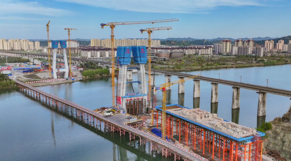 3月25日,在成达万高铁遂宁涪江特大桥建设现场,工人正在进行斜拉桥塔柱及边跨现浇梁施工。