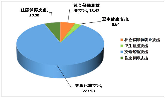 2020年一般公共预算财政拨款支出319.49万元,主要用于以下方面:社会保障和就业支出(类)18.42万元,占5.77%;卫生健康支出(类)8.64万元,占2.70%;交通运输支出(类)272.53万元,占85.30%;住房保障支出(类)19.90万元,占6.23%。