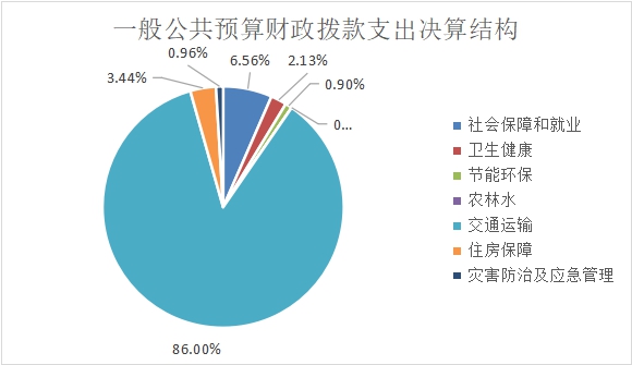 2021年一般公共预算财政拨款支出1253.25万元,主要用于以下方面: 社会保障和就业支出82.19万元,占6.56%;卫生健康支出26.66万元,占2.13%;节能环保支出11.34万元,占0.9%;农林水支出0.15万元,占0.00%,交通运输支出1,077.84万元,占86%;住房保障支出43.08万元,占3.44%;灾害防治及应急管理支出12万元,占0.96%。