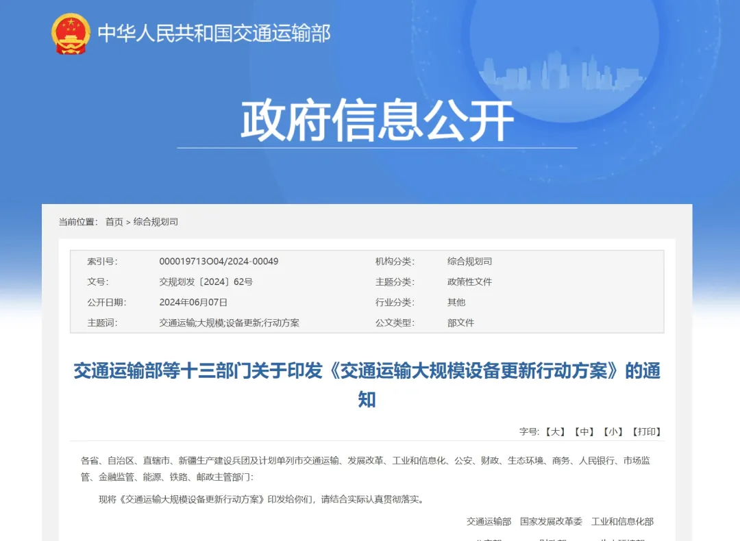 日前,交通运输部、国家发展改革委、工业和信息化部等十三部门联合印发《交通运输大规模设备更新行动方案》(以下简称《方案》),将实施城市公交车电动化替代、老旧营运柴油货车淘汰更新、老旧营运船舶报废更新、老旧机车淘汰更新、邮政快递老旧设备替代、物流设施设备更新改造、标准提升七大行动,大力促进先进设备和北斗终端应用,促进交通能源动力系统清洁化、低碳化、高效化发展,有序推进行业绿色低碳转型。
