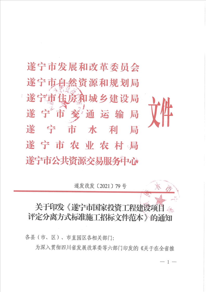 遂宁市发展和改革委员会等7部门关于印发《遂宁市国家投资工程建设项目评定分离方式标准施工招标文件范本》的通知(遂发改发〔2021〕79号)