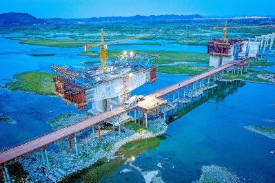 7月6日,记者来到我市黄连沱渡改桥项目建设现场,虽已至傍晚,但现场机声隆隆,一派繁忙。据悉,该项目为一级公路,全长2.764km,设计速度60km/h,路基宽度28m。项目起点位于沪蓉高速遂宁出口红涪收费站,终点与S205线平交。目前,该项目正加速推进主桥桥梁、中桥现浇梁、预制梁生产等工程施工,力争今年底实现主桥合龙。项目建成后,将改变两岸居民的交通出行方式,促进地方经济快速发展。